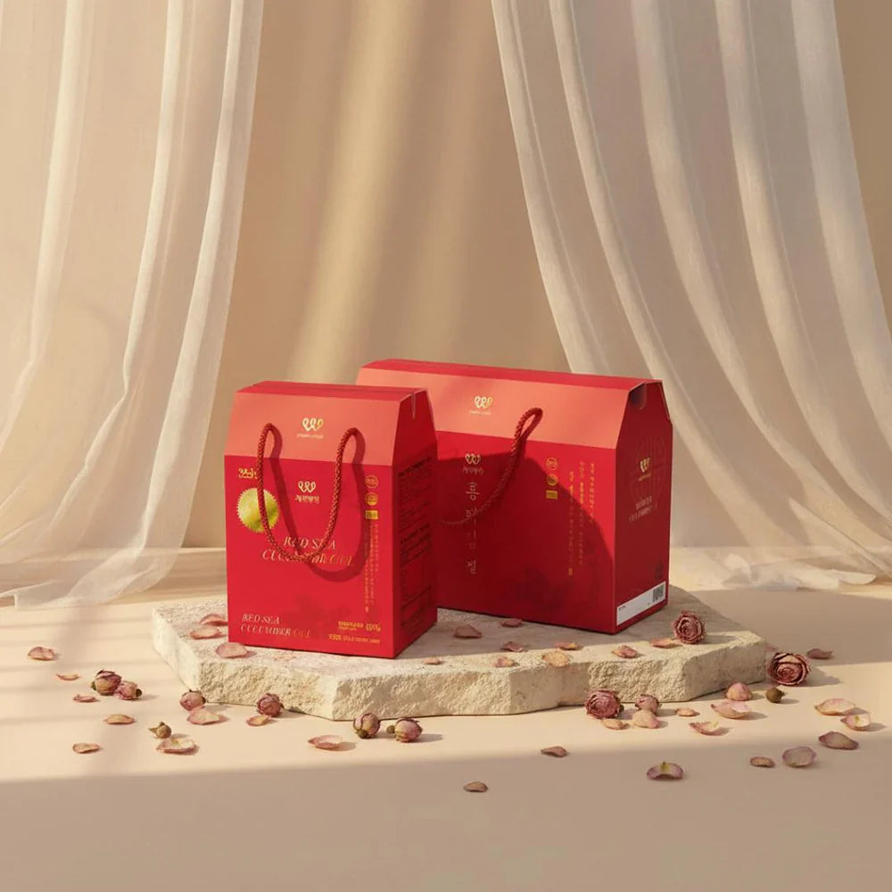 產品內容:為一盒禮盒包裝,共60隻野生紅海參修復膠。
